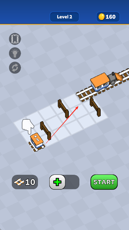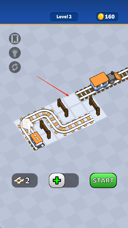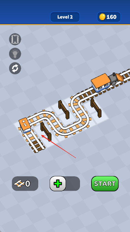 1、进入【Level2】关卡,查看铁轨场景,按红箭头方向点击并拖动橙色车厢调整位置。