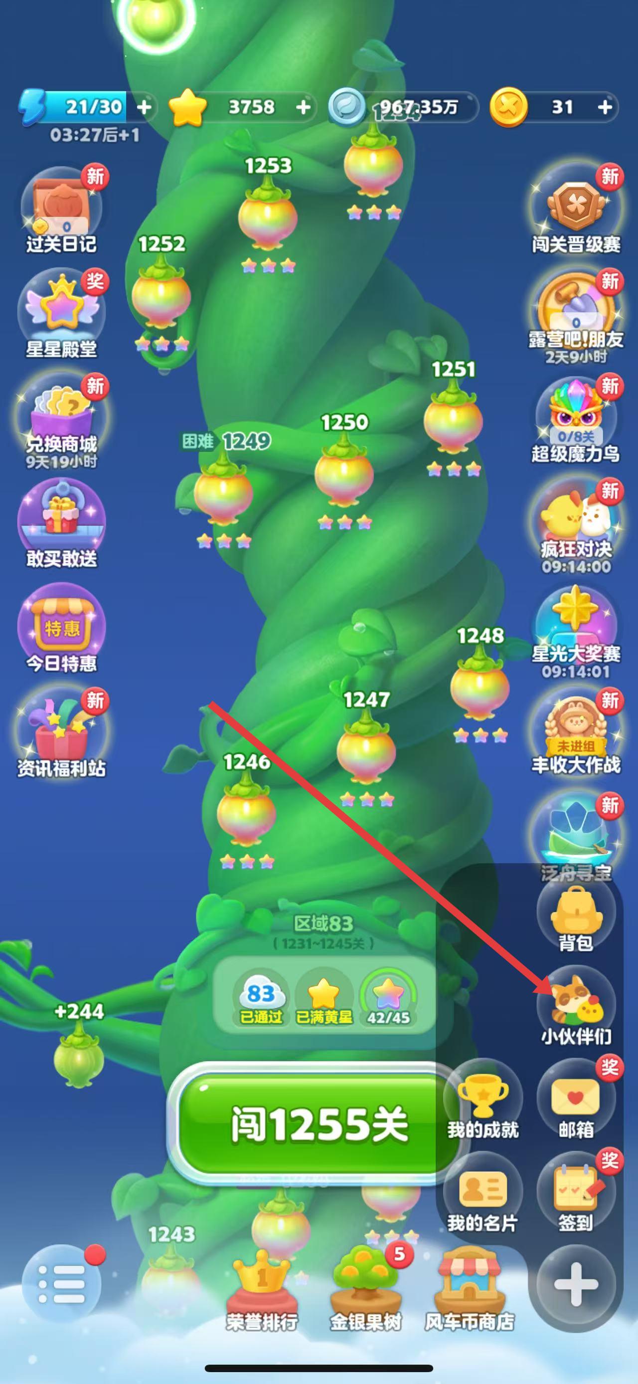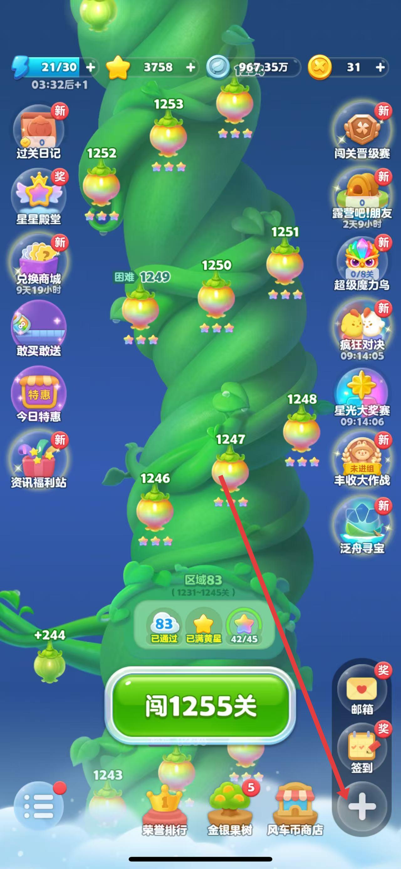 1、打开开心消消乐游戏,点击游戏主界面右下角的加号图标,展开隐藏功能菜单。