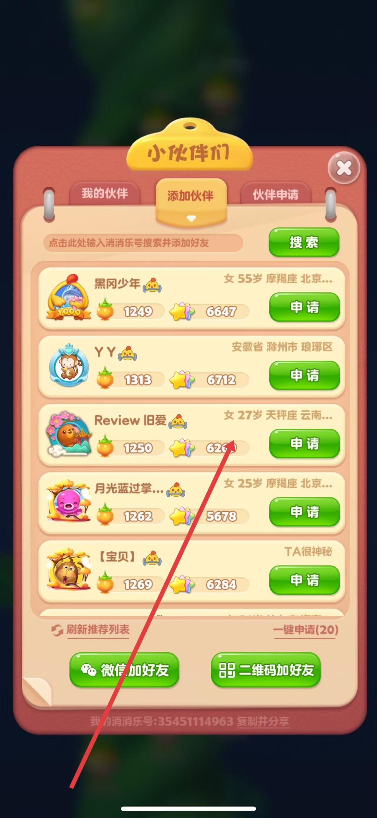 3、在添加伙伴页面,可在输入框输入消消乐号搜索并添加好友;也可在下方推荐列表中,找到想添加的好友,点击其对应的申请按钮,发送好友申请。