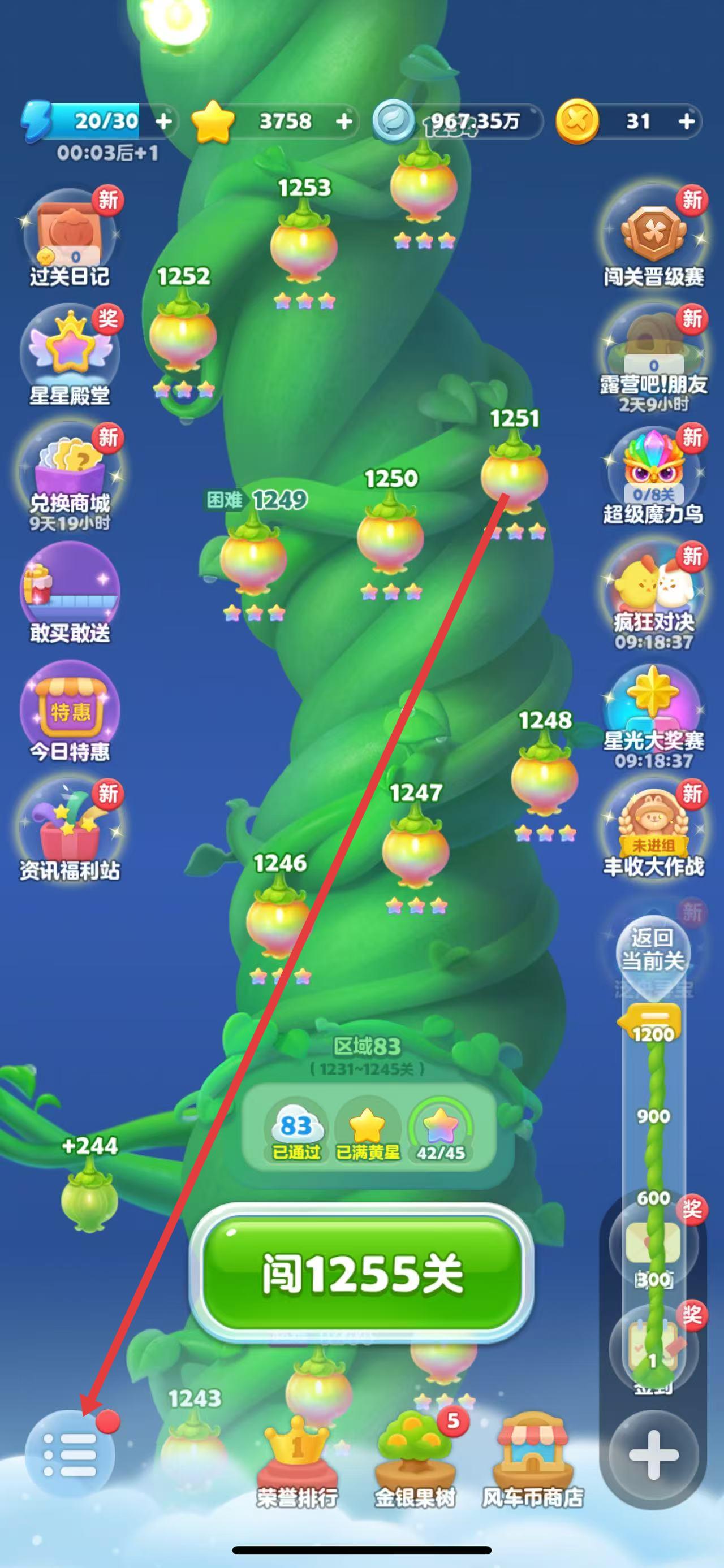 1、打开开心消消乐游戏,点击游戏主界面左下角的三横线图标,展开隐藏菜单。