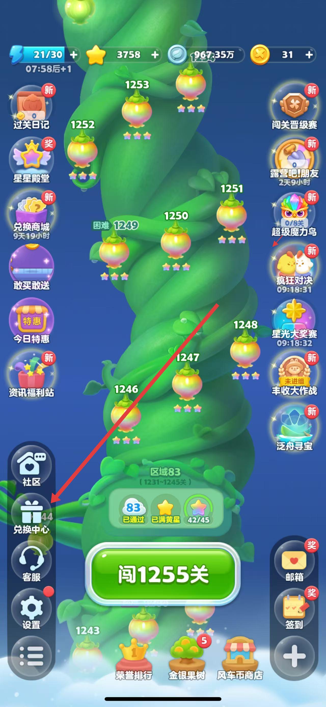 2、在展开的隐藏菜单中,点击兑换中心图标,进入兑换页面。