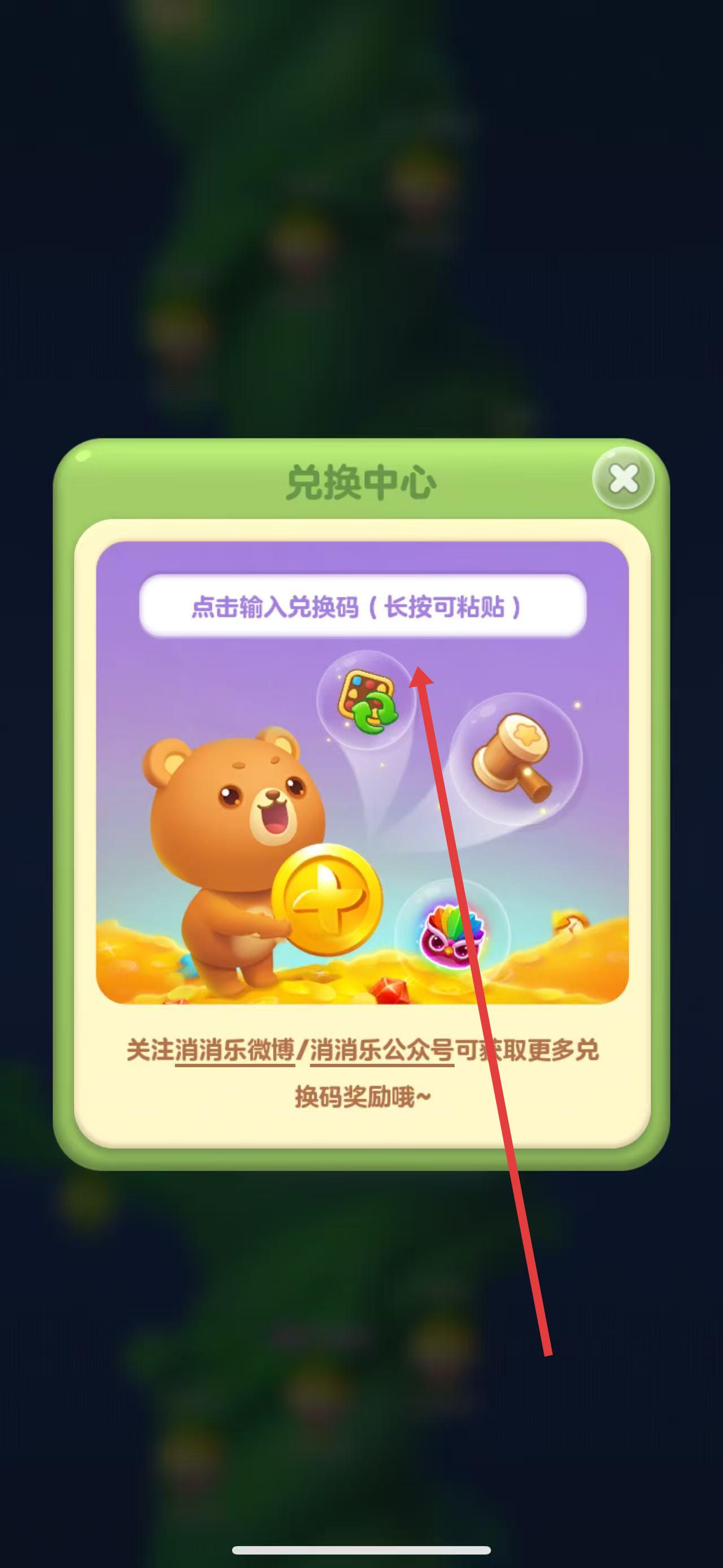 3、在兑换中心页面,点击输入框,输入获取到的兑换码, 确认后即可兑换相应奖励,关注消消乐微博或公众号能获取更多兑换码哦。