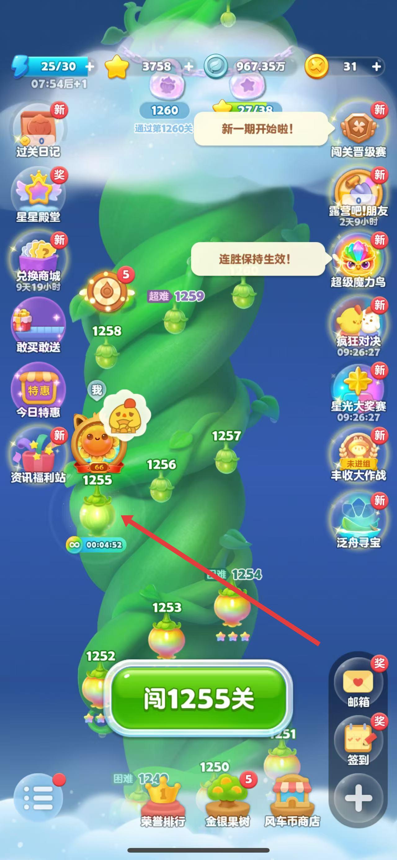 1、打开开心消消乐游戏,在主界面选择要挑战的关卡,如点击闯1255关进入关卡准备页面。
