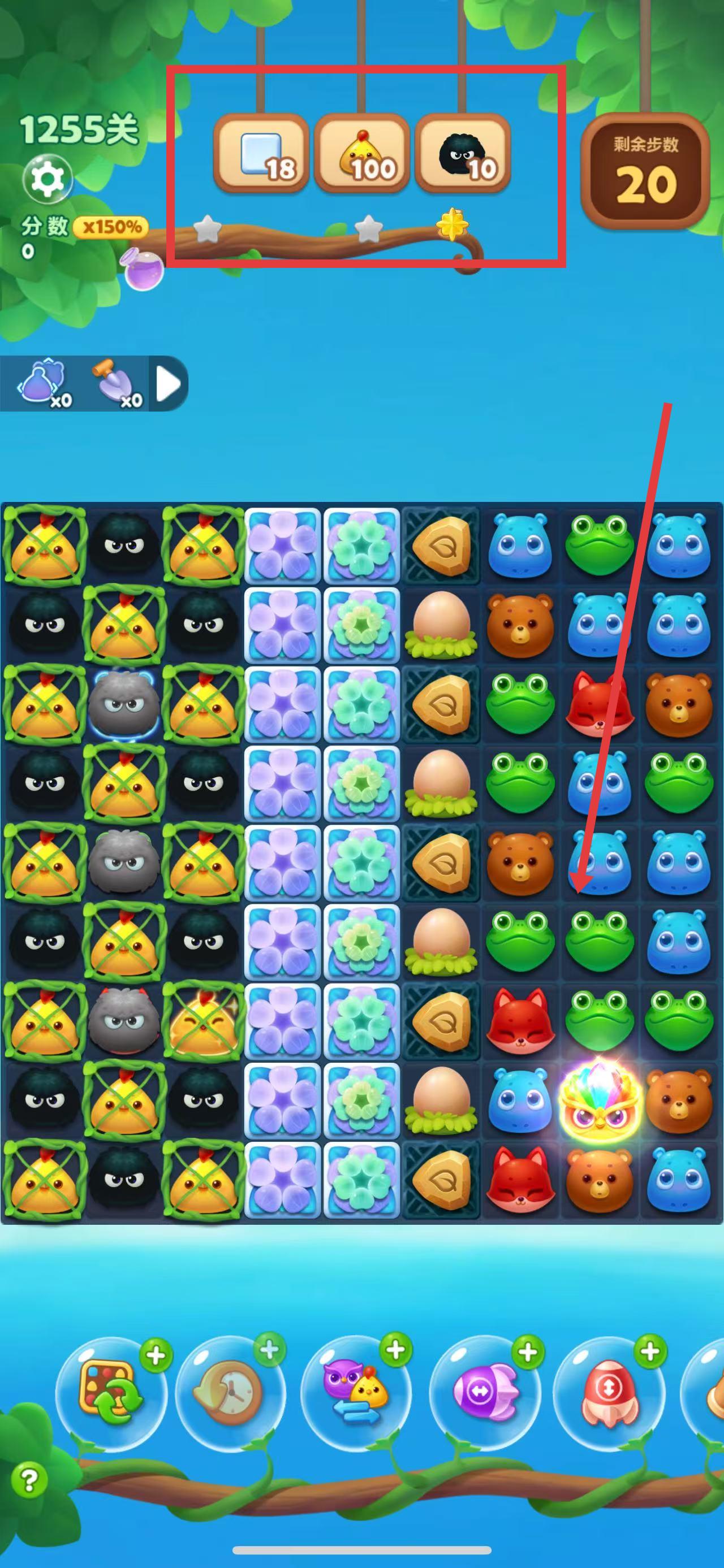 3、进入游戏关卡后,通过交换相邻两个动物的位置,使三个及以上相同的动物连成一线横或竖即可消除它们。