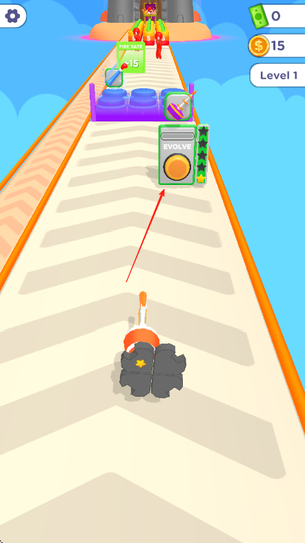 1、在【Level1】关卡中,操控角色前进,看到【EVOLVE】按钮后按红箭头方向点击进行进化。