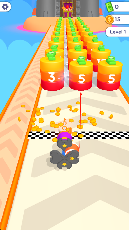 3、持续前进收集金币,躲避障碍,选择带有更高数字的道具路线行进,冲击关卡终点完成挑战。