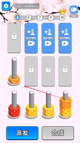 2、道具使用策略:合理利用游戏中的道具,如颜色替换道具,可将一种螺丝颜色变为所需颜色,在关键时候打破僵局,消除道具则能瞬间消除场上同色螺丝。