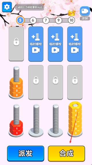 3、完成一定数量螺栓合并后,点击下方【合成】按钮,进行批量合成,提升整体等级,推进游戏进程。