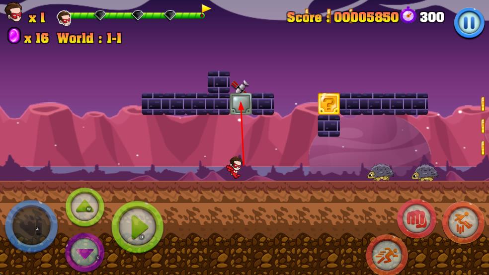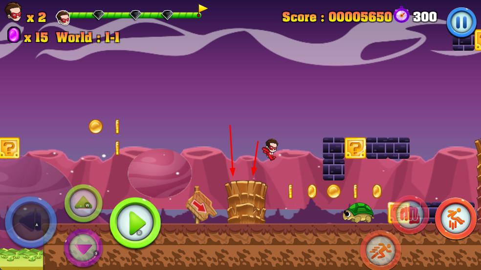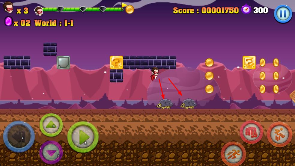1、操控角色移动、跳跃,避障战敌,闯横版关卡。