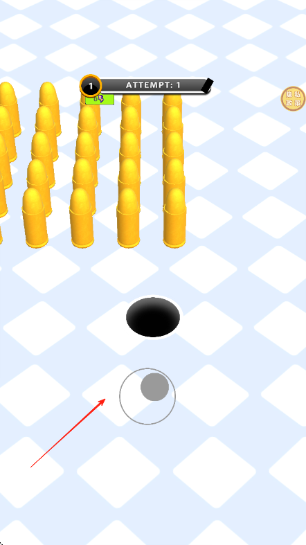 1、拖动下方灰色圆环,控制黑洞移动方向,按红箭头引导黑洞靠近黄色弹药堆。