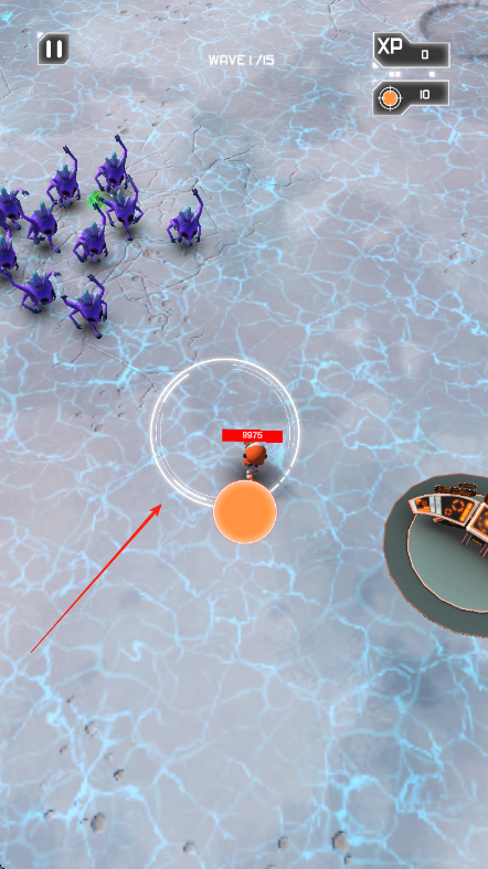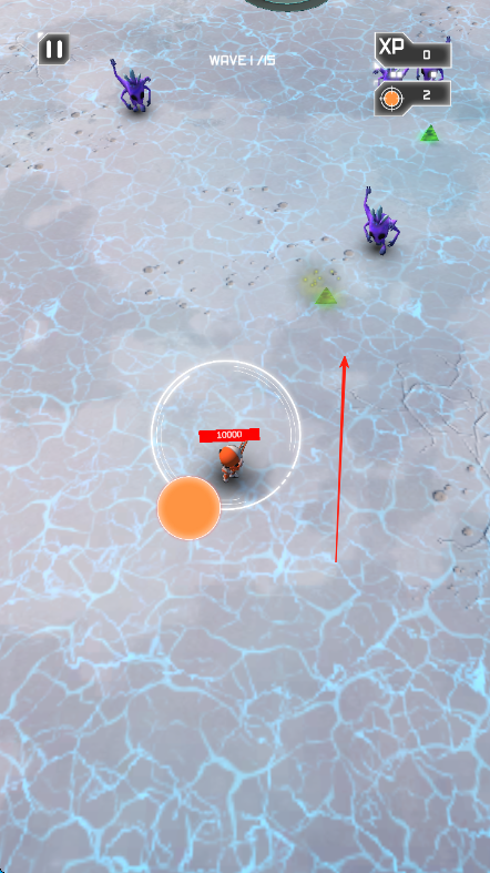 1、游戏开始,通过左下角橙色轮盘操控太空人移动,按红箭头方向躲避紫色怪物攻击,同时靠近怪物进行反击。