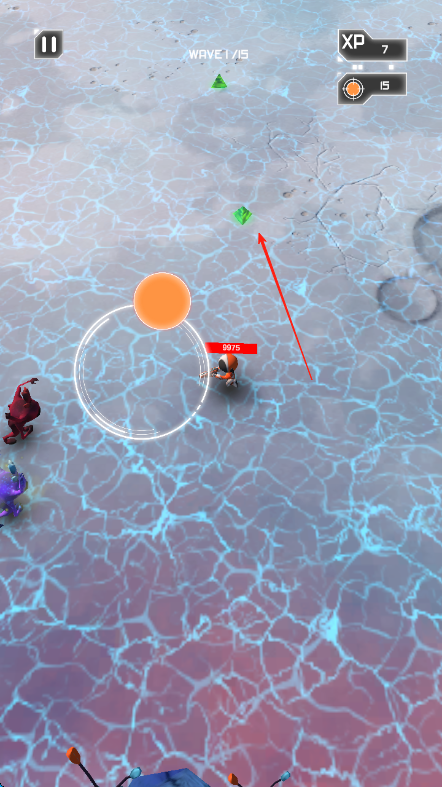 3、击败怪物后,会掉落绿色经验道具,按红箭头方向操控太空人收集,提升等级获取技能点,增强太空人能力。