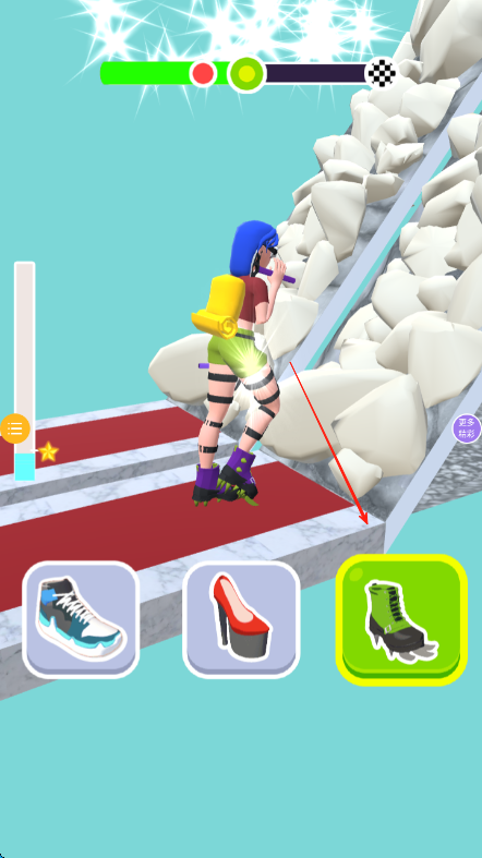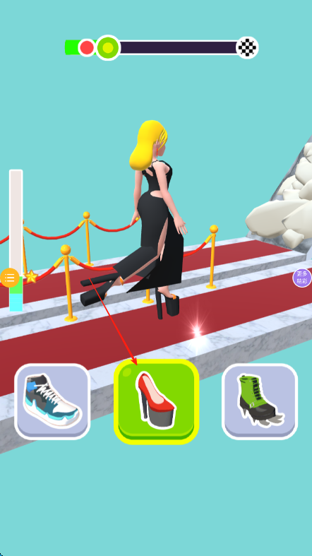 1、游戏开始,操控角色在红毯上前进,遇到障碍时,点击下方合适的鞋子图标,更换鞋子来应对。