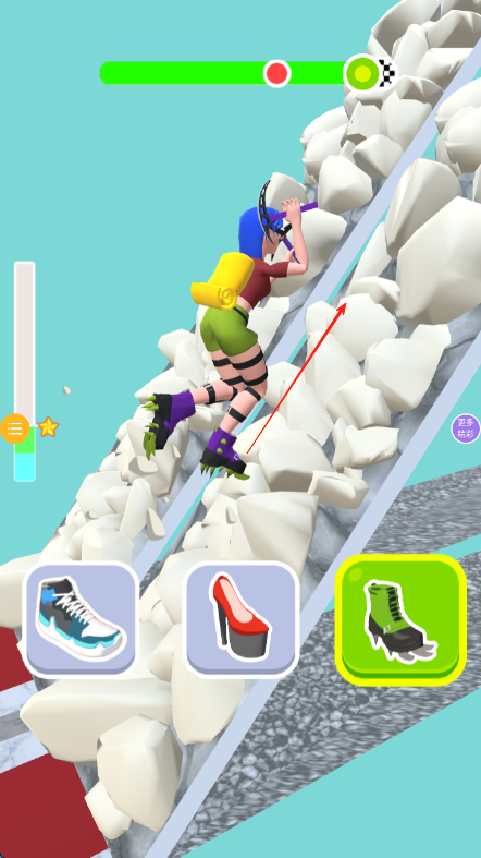 3、留意上方进度条,合理规划鞋子更换策略,让角色快速且顺利地通过各种地形,抵达终点完成关卡。