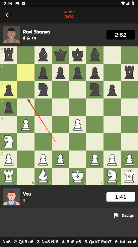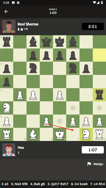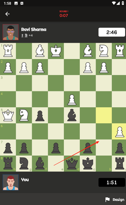 1、在对局开始后,按照国际象棋规则,点击己方棋子,按红箭头方向移动到合适位置,与对手RaviSharma展开博弈。