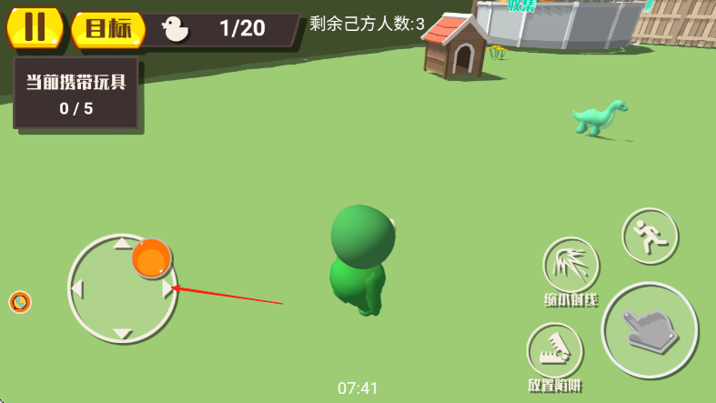 2、通过左下角方向轮盘操控绿色小人移动,在场景中巡逻,寻找并阻止孩子拿到玩具。