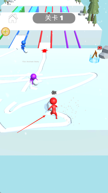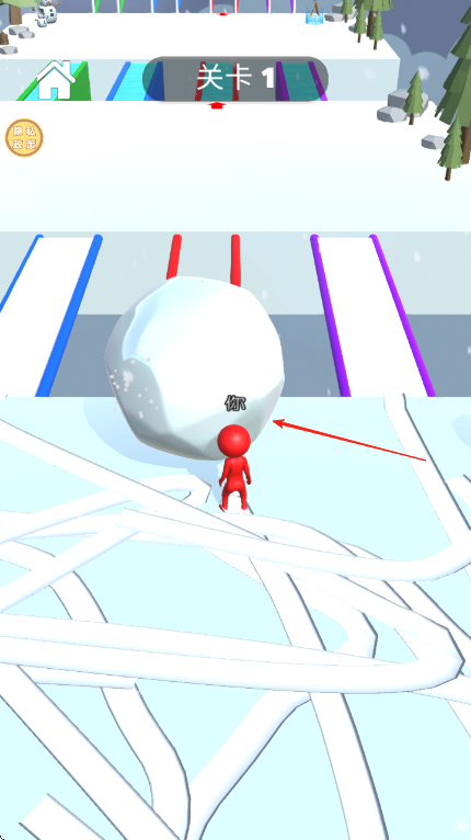 1、在关卡1中,操控红色小人按红箭头方向在雪地移动,推动雪球使其逐渐变大。