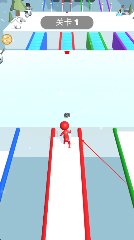 2、留意前方不同颜色的滑道,选择与雪球颜色适配或能让雪球顺利通过的滑道,按红箭头指引进入滑道。