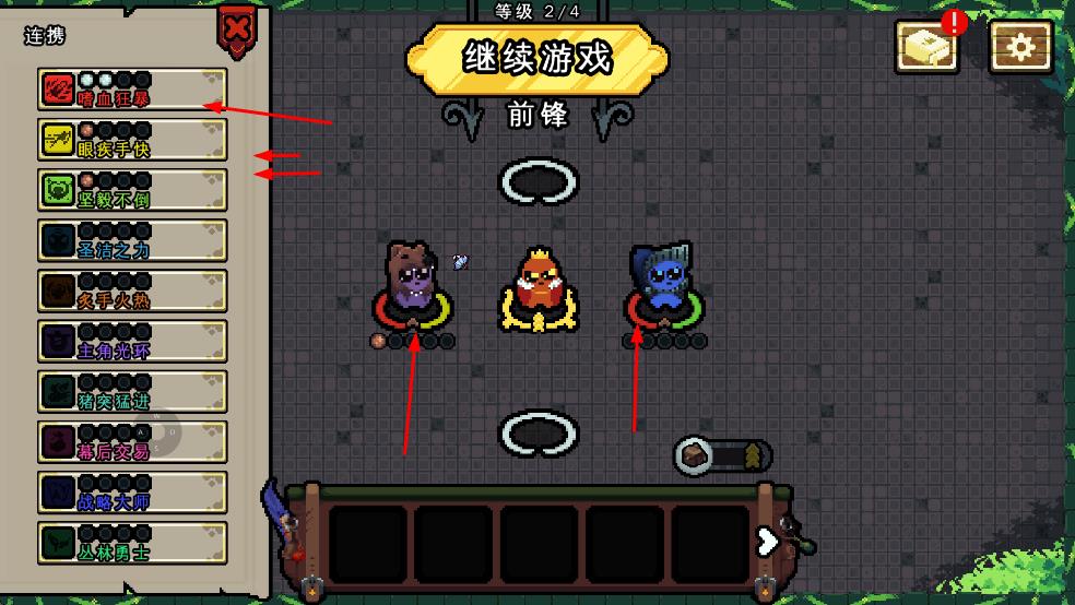 2、打开连携界面,搭配左侧嗜血狂暴等技能,布置英雄至前锋位,组合战力应对挑战。