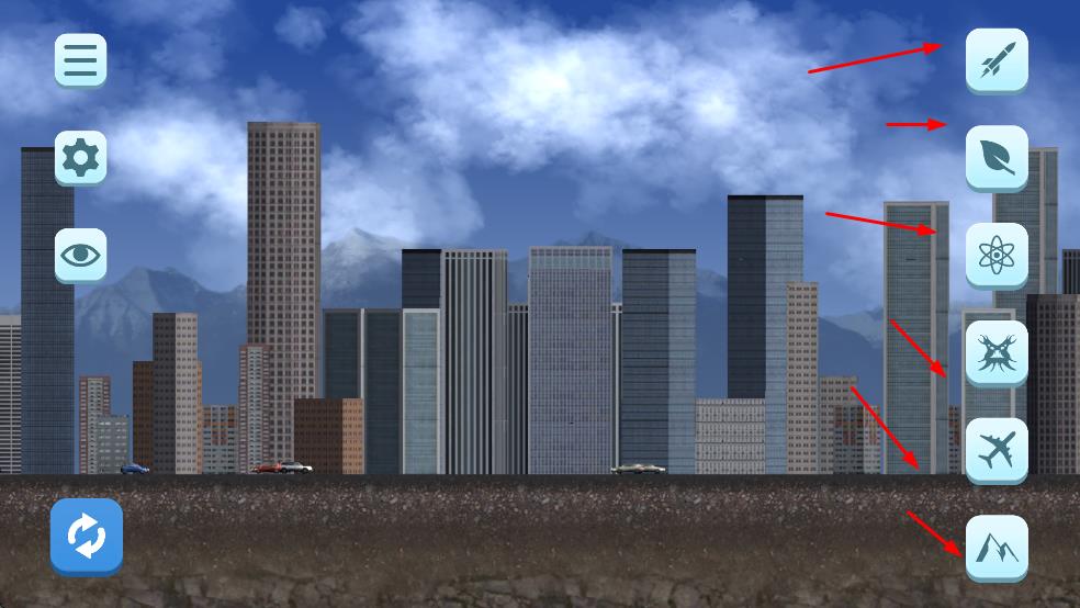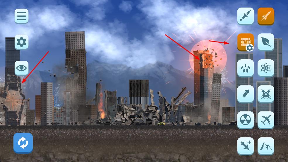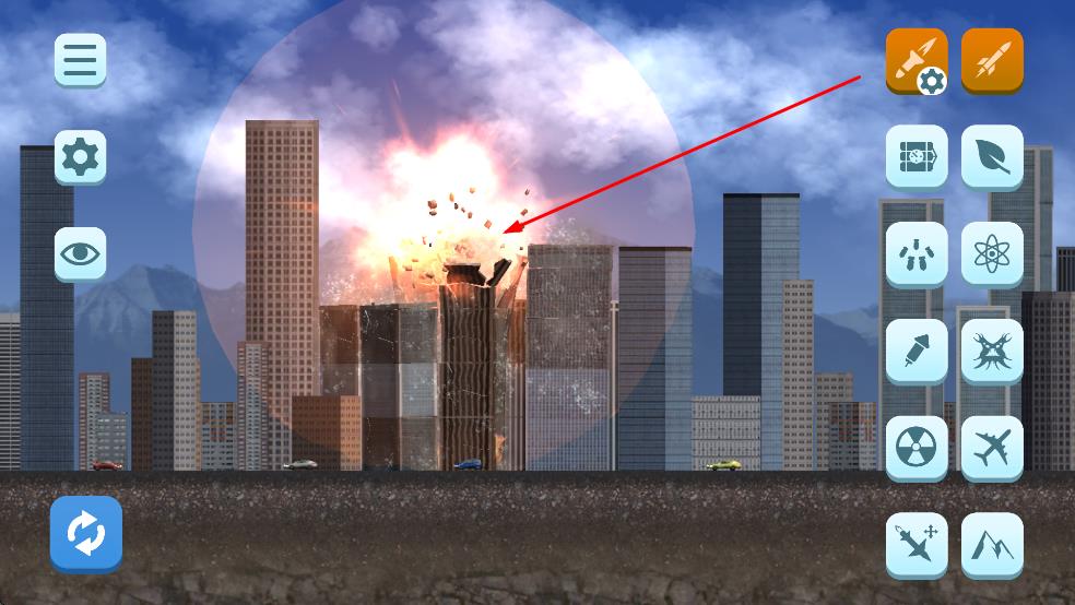 1、点击右侧图标火箭、核爆、自然灾难等,选定破坏工具。