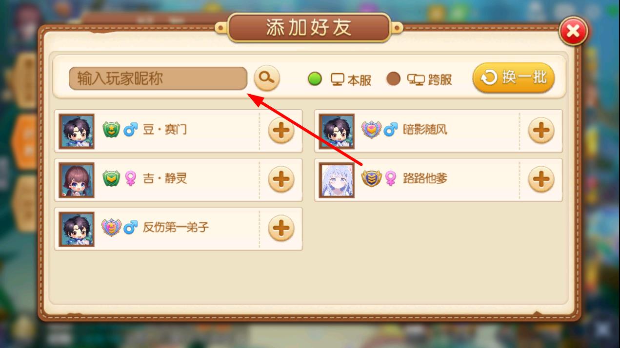 3、在添加好友页面,可以在搜索框中输入玩家昵称进行精准查找,也可以点击换一批浏览推荐玩家,然后点击玩家发送好友申请。