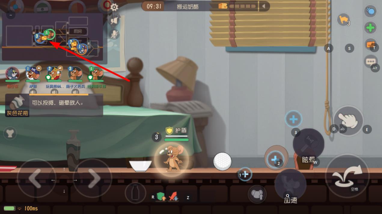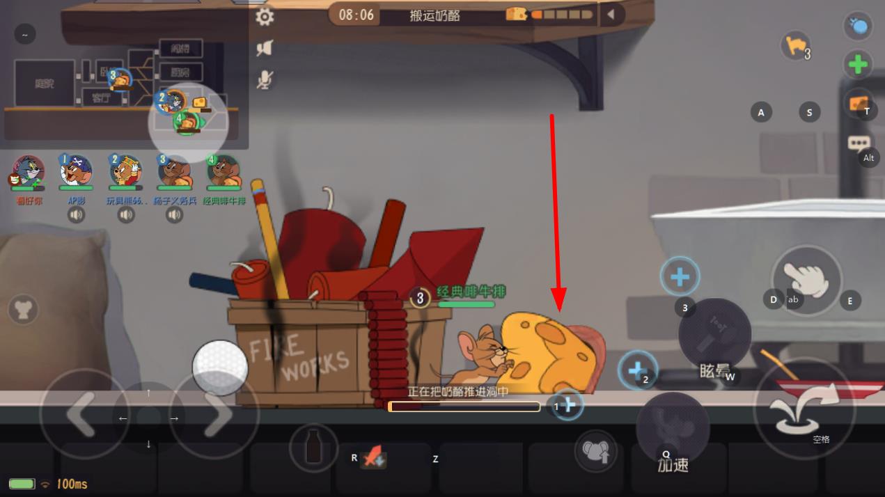 1、进入猫和老鼠游戏的搬运奶酪对局后,先留意左上角的小地图,通过小地图能知晓奶酪和敌人的位置,方便制定行动路线。