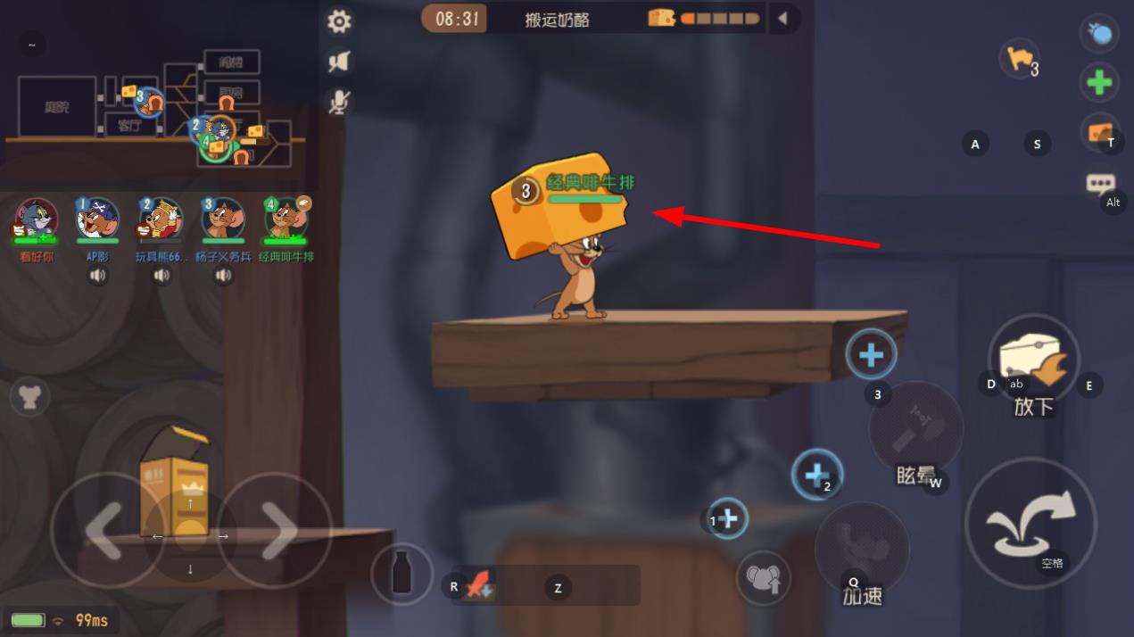 2、操控角色找到奶酪后,靠近奶酪点击相应的交互按钮,让角色扛起奶酪,此时要注意躲避猫咪的抓捕。