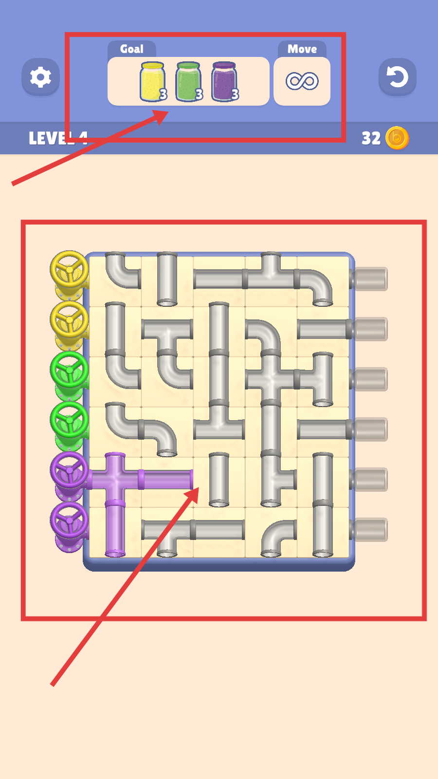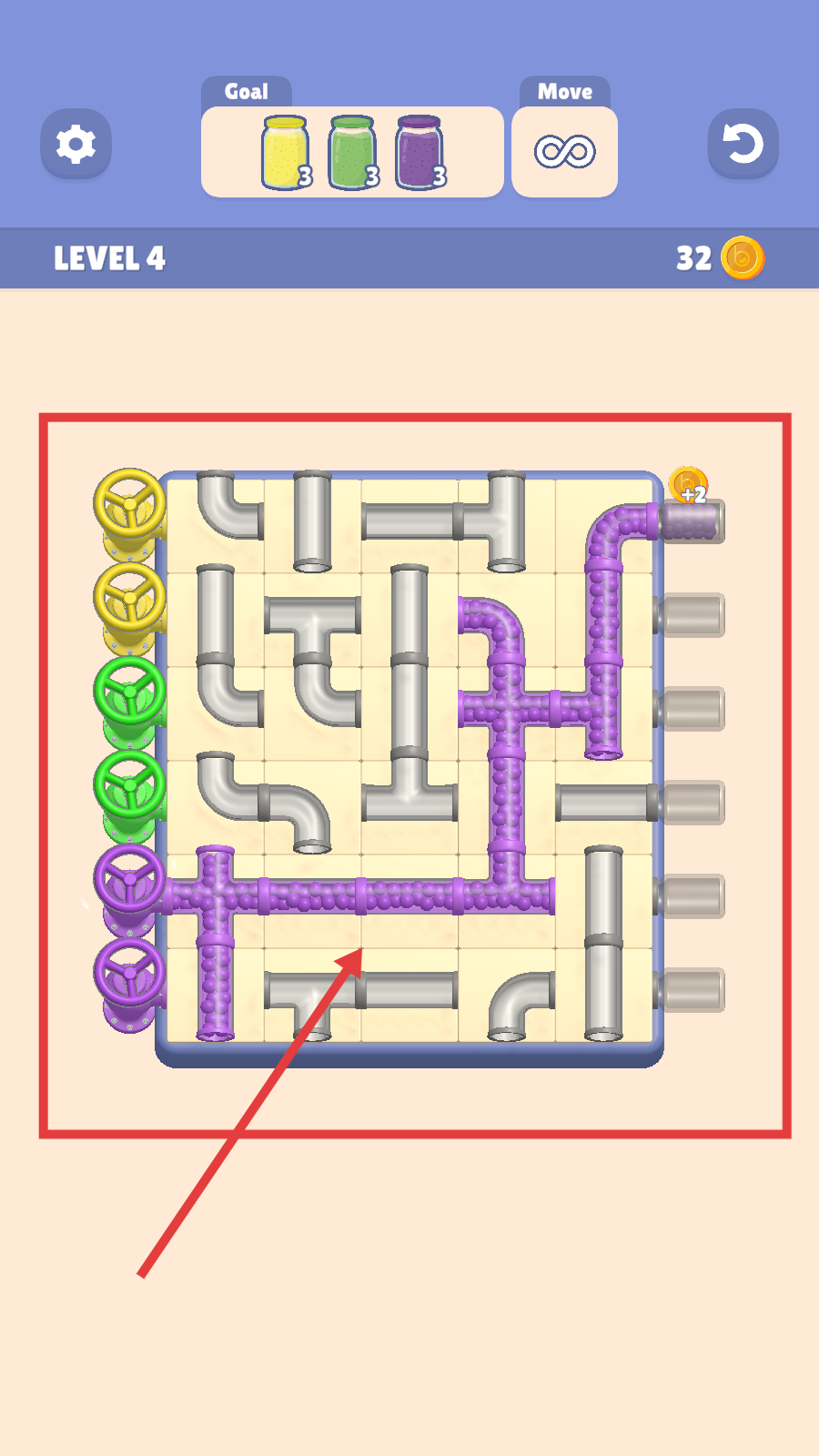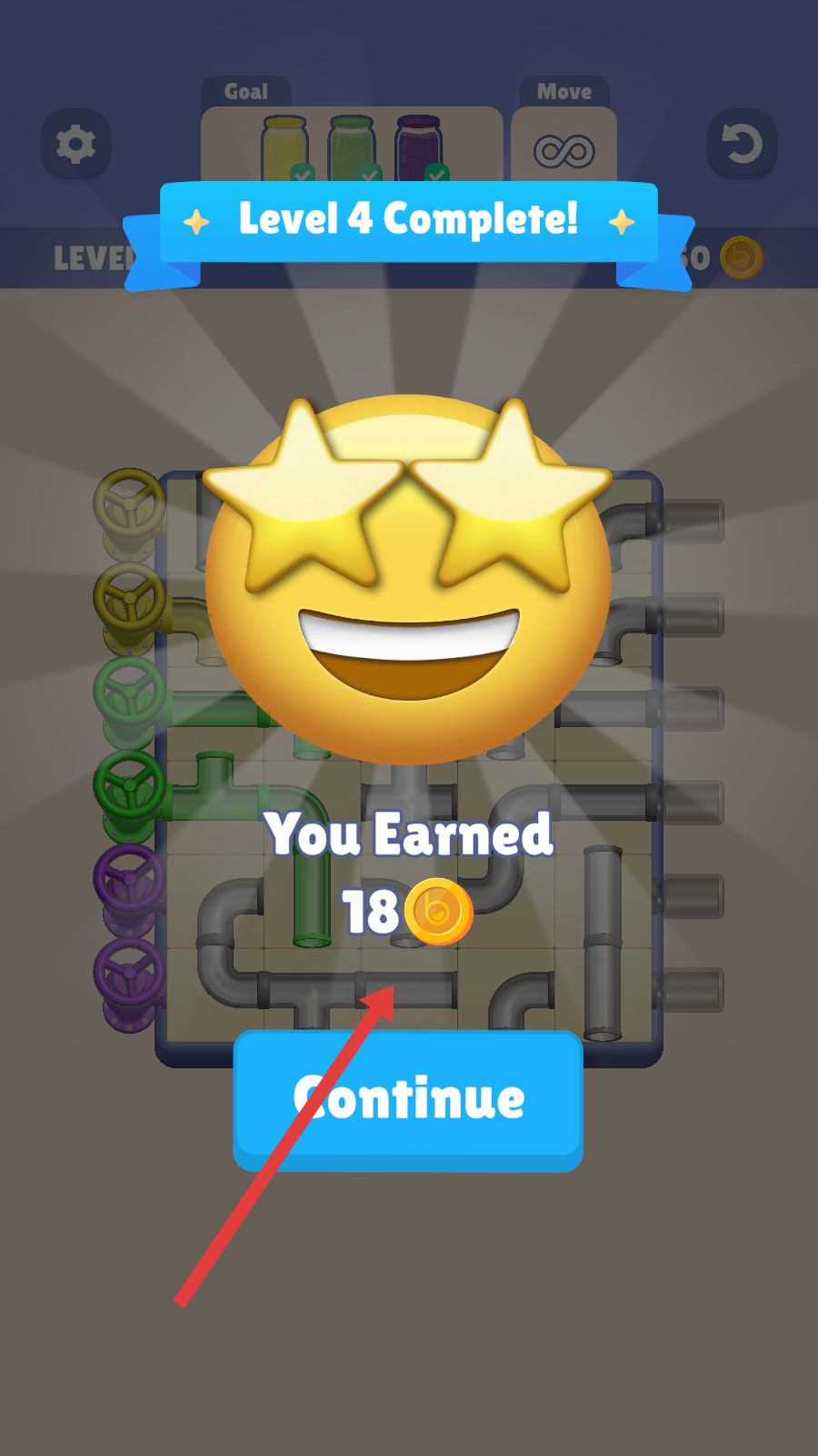 3.管道连通后,触发“Level4Complete”,获得18金币,点击【Continue】进入下一关。
