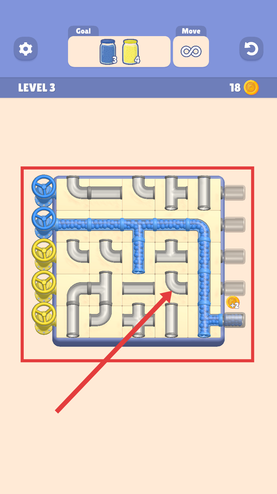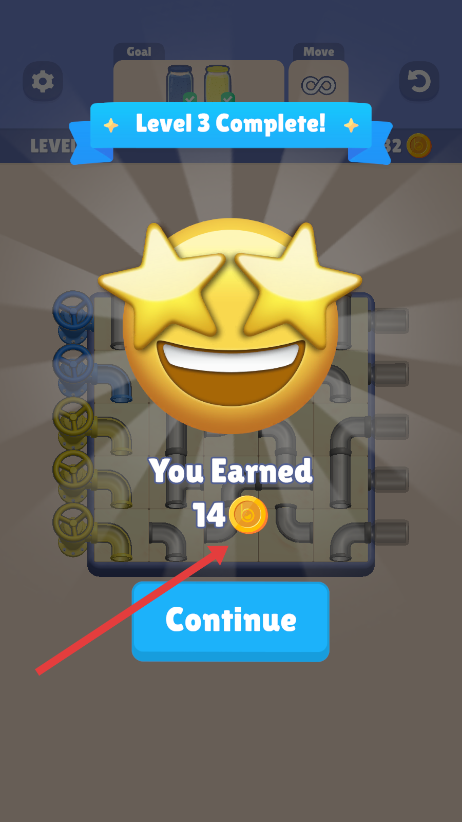 3、确保液流满足目标(蓝色3、黄色4),管道连通后,触发“Leve3Complete”结算,获得14金币,点击【Continue】进入下一关。