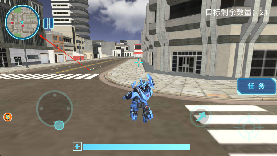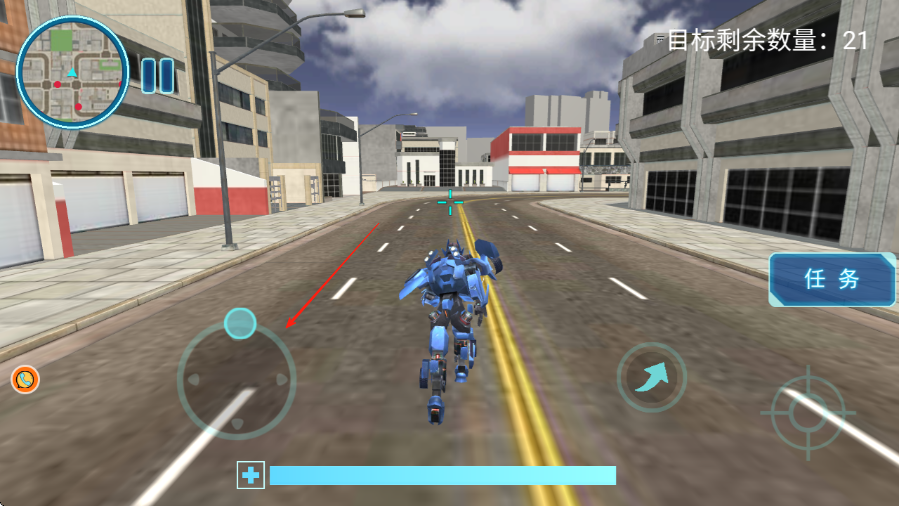 1、进入游戏,通过左下方虚拟摇杆红箭头所指控制蓝色机器人在城市街道移动。