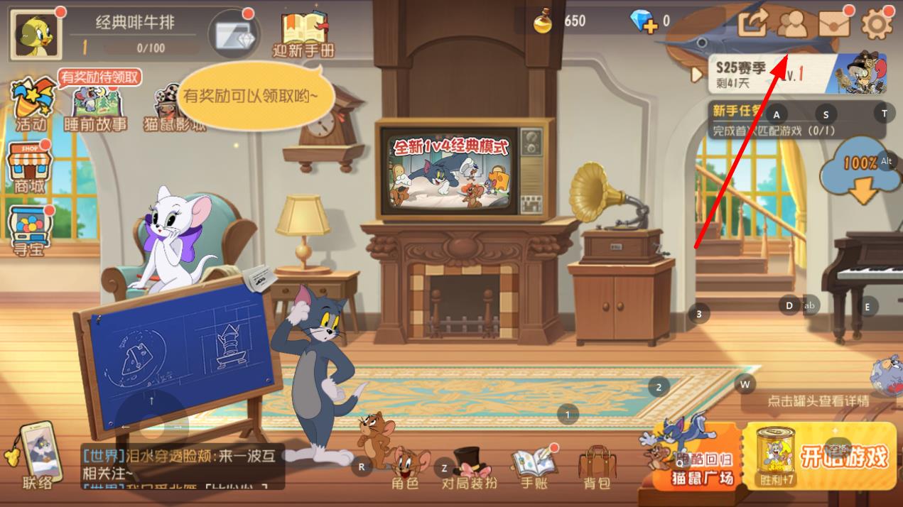 1、进入猫和老鼠游戏后,点击界面右上角的好友图标进入好友管理界面,为添加好友做准备。
