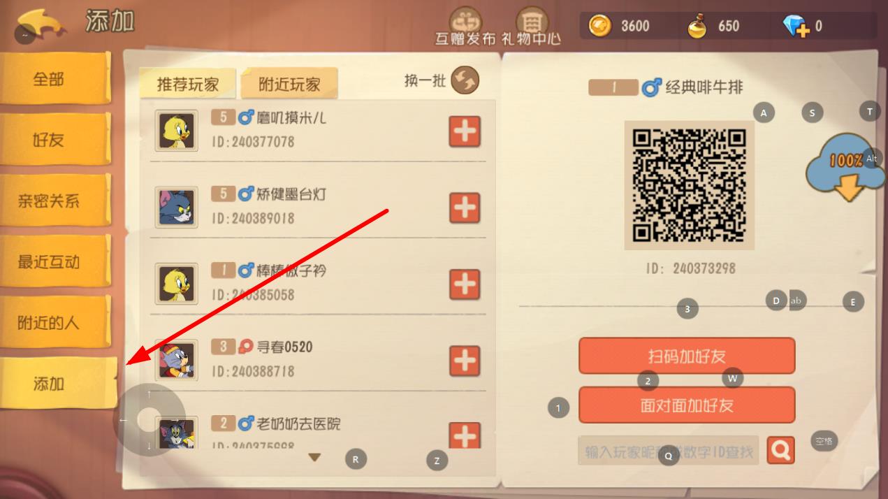 2、在好友管理界面点击左侧的添加选项,这时右侧会显示推荐玩家列表,点击玩家头像旁的即可向该玩家发送好友申请。