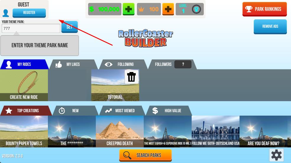 1、注册账号,设置主题公园名称;浏览TOP CREATIONS,NEW等板块的过山车作品,或用SEARCH PARKS查找。