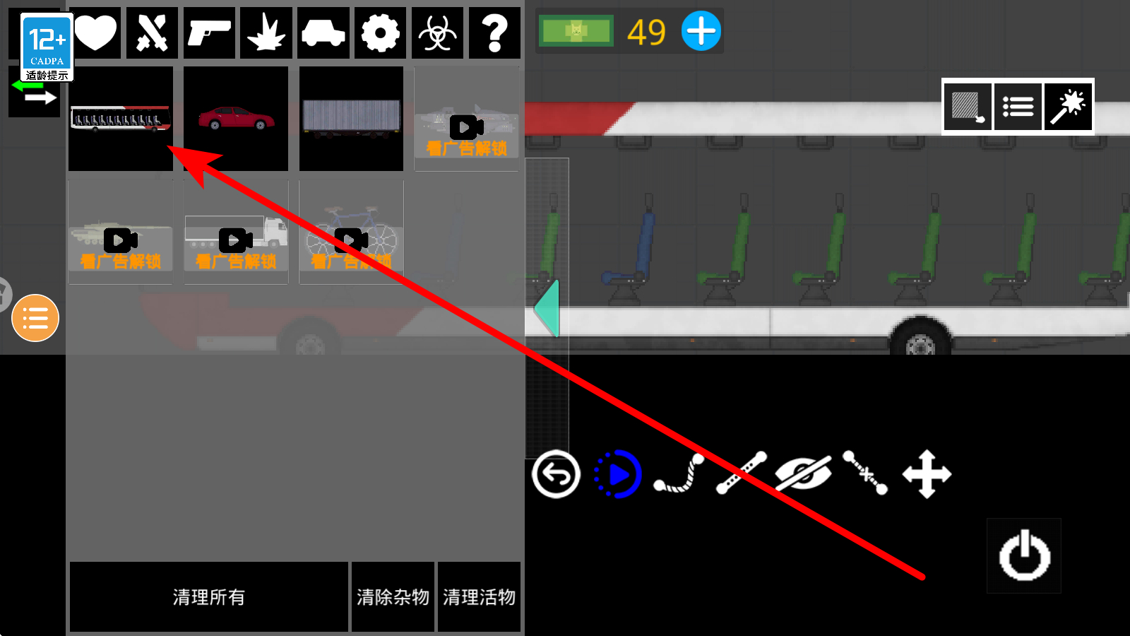 1、选载具道具界面左侧栏切换至车辆分类,点击对应载具图标中列车样式,将其拖放至场景内,为撞击等物理互动提供工具,丰富实验手段。