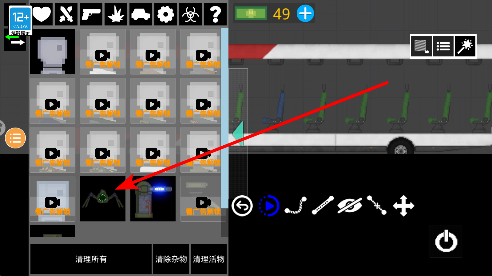 3、放置生物选中解锁的生物金雀花坐车里,拖动至场景指定位置座椅区域,搭配载具等道具,触发生物与道具间的物理反应,探索新奇互动效果。