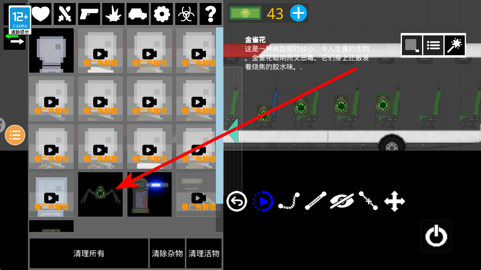 2、解锁生物切换左侧栏到生物分类,找到需观看广告解锁的生物中奇异造型生物,完成广告观看后获取,增添场景互动对象多样性。