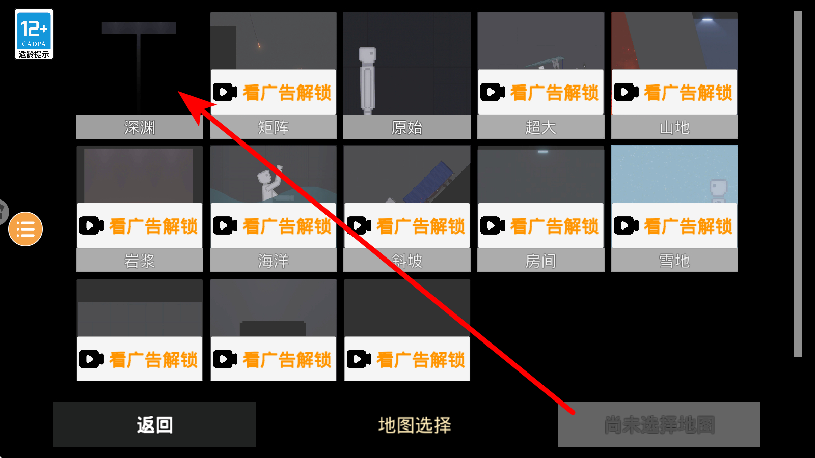 1、启动选图主界面点击开始游戏,进入地图选择页,可见深渊矩阵等初始地图,部分需看广告解锁,选定地图后进入对应场景。