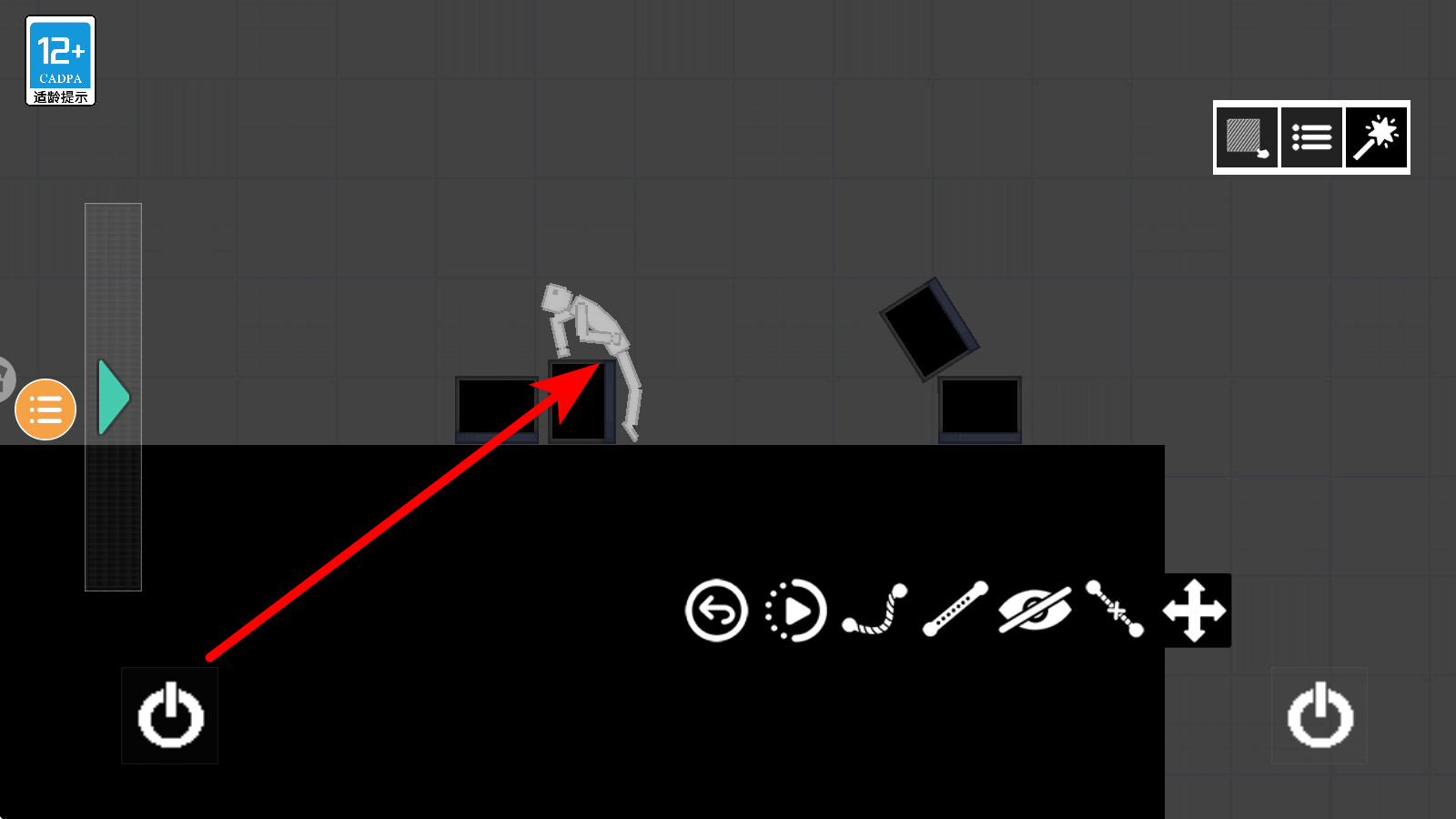 2、场景操作进入地图后,界面下方陈列工具,点击选取工具,作用于火柴人或场景物品,触发推动、破坏等物理反馈,开展互动。