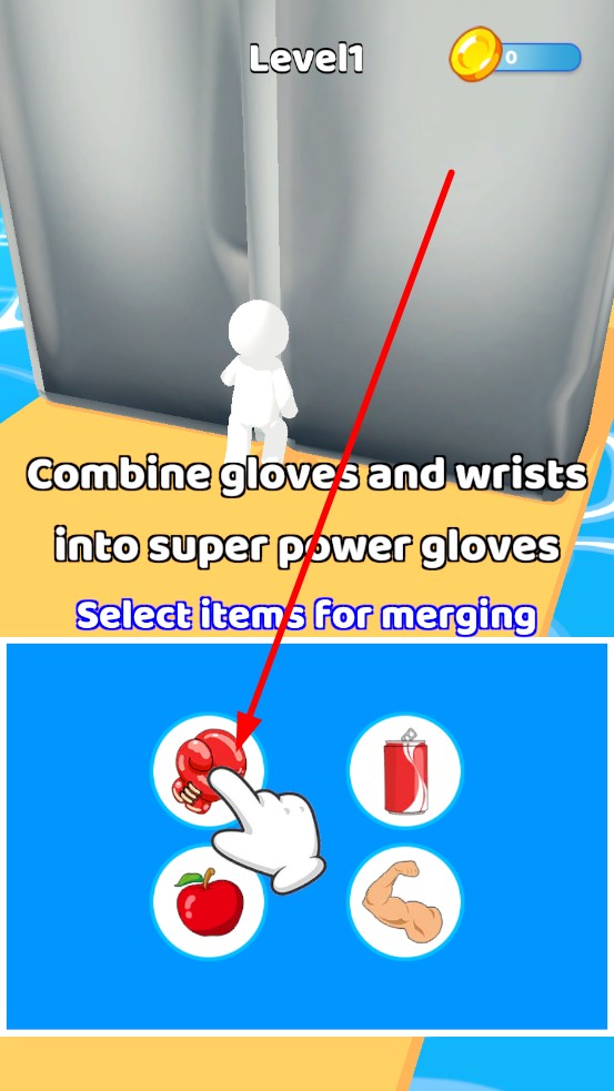 1、进入关卡,观察前方的障碍物品,在合成节点中,从四个物品中选取两类功能关联道具,合成超级拳套,获得破墙能力,推开墙壁。