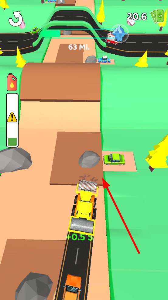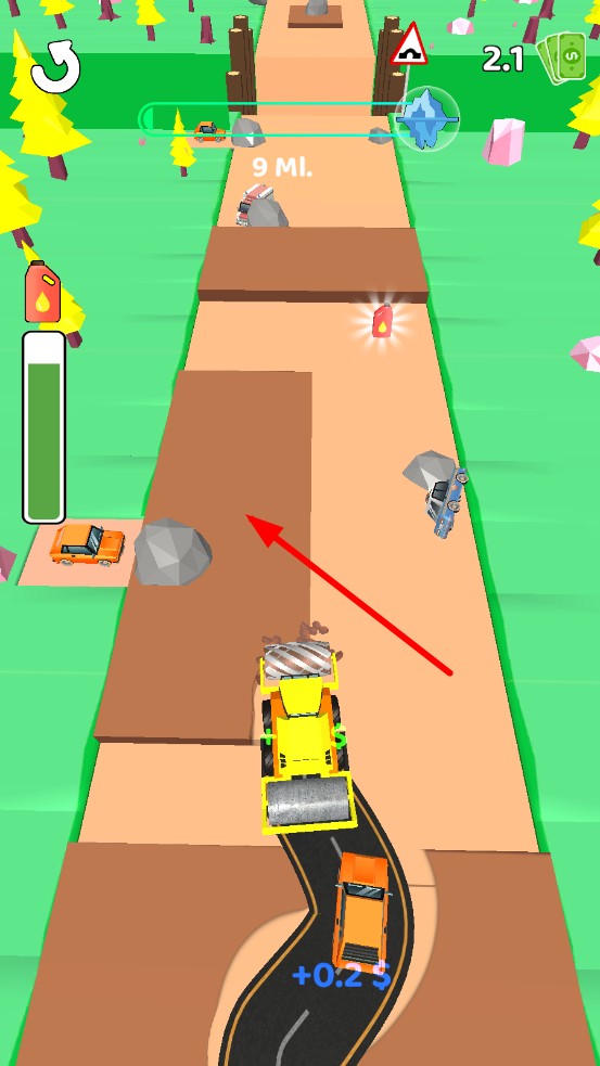 1、进入关卡操控摊铺机稳步前进,碾碎碎石收集路面板块,留意燃油条消耗,拾取燃油道具,为长距离推进提前储备能量。