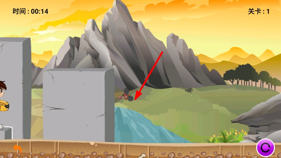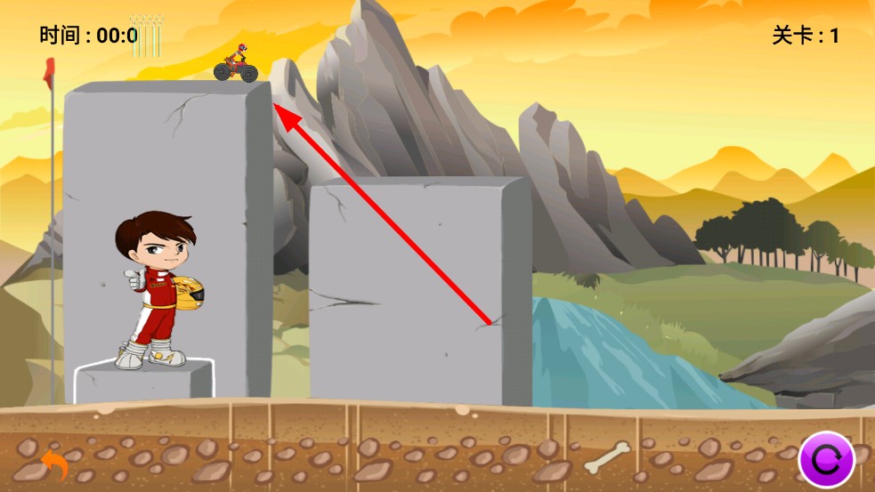 1、进入关卡,通过点击屏幕右侧控制摩托平衡,长按加速冲坡,腾空时滑动屏幕触发空翻特技跨越深沟;
