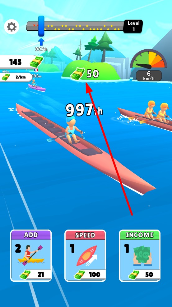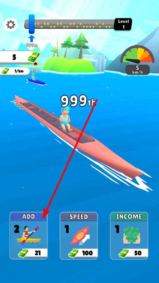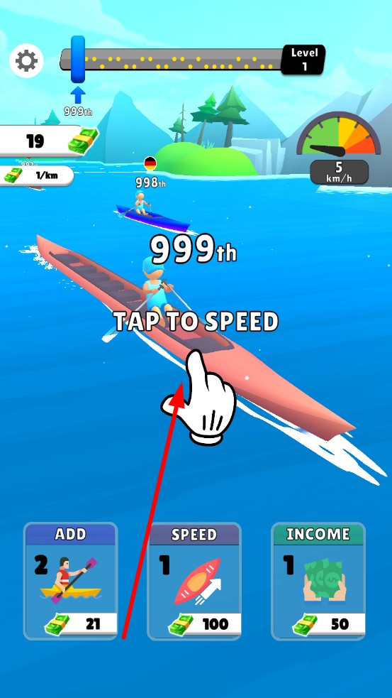 1、进入赛道后,点击赛艇区域即可触发加速,消耗金币,可升级人数、速度以及金币收益,优先点击底部招募划手。
