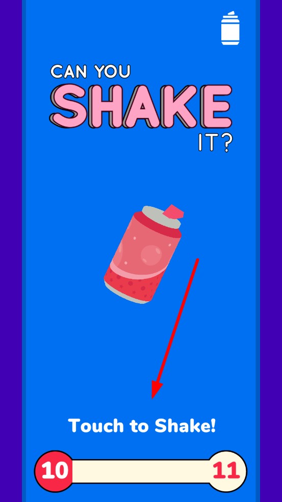 1、进入游戏后,主界面显示CAN YOU SHAKE IT,点击Touch to Shake,提示区域触发摇晃指令,控制易拉罐从初始倾斜姿态,向金币区域移动。