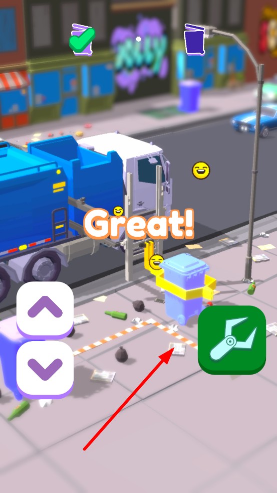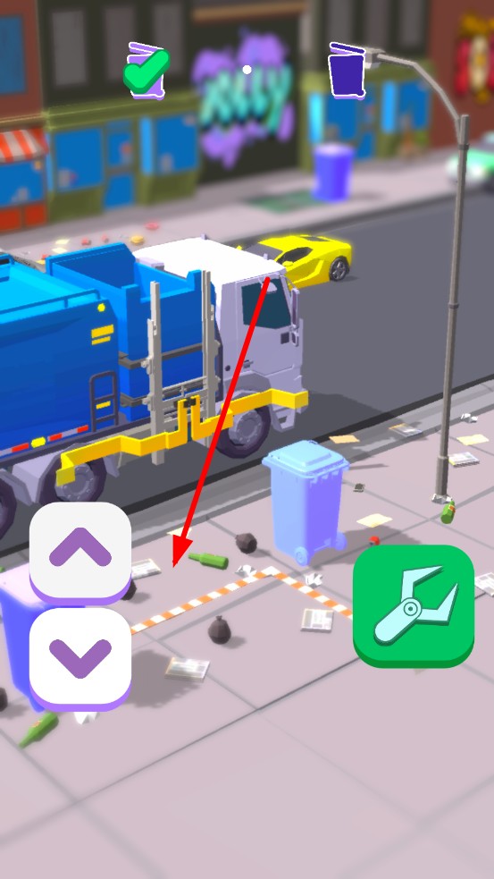 1、进入游戏后,街道场景中点击上下箭头按钮,控制垃圾车机械臂伸缩摆动,调整机械臂角度对准垃圾桶,准备开启抓取操作。