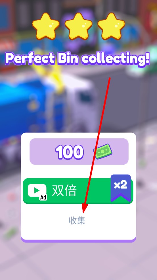 3、完成街道清洁后,界面弹出结算面板,展示金币奖励数值,点击收集直接领取收益,若想翻倍奖励,可选择观看广告,解锁更高效的清洁工具。