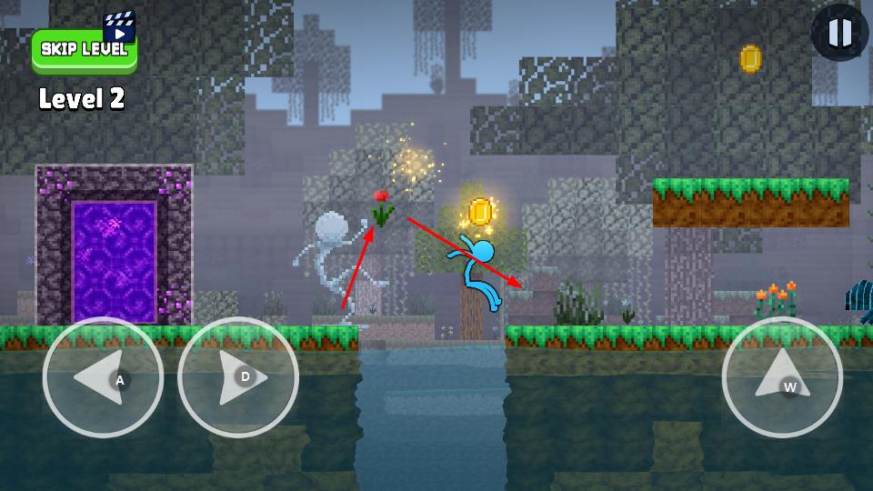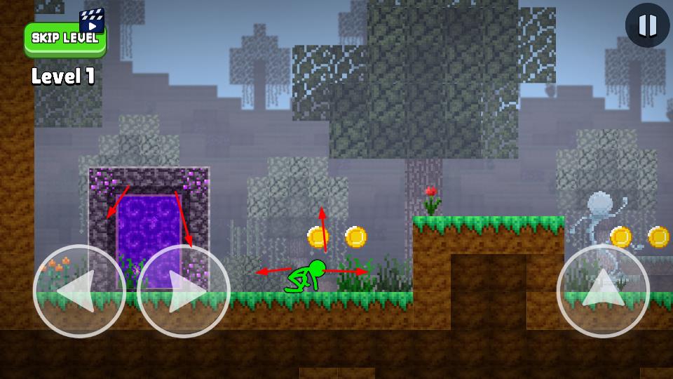 1、进入Level1,通过左下角方向键控制火柴人移动,收集场景内金币,靠近紫色传送门。