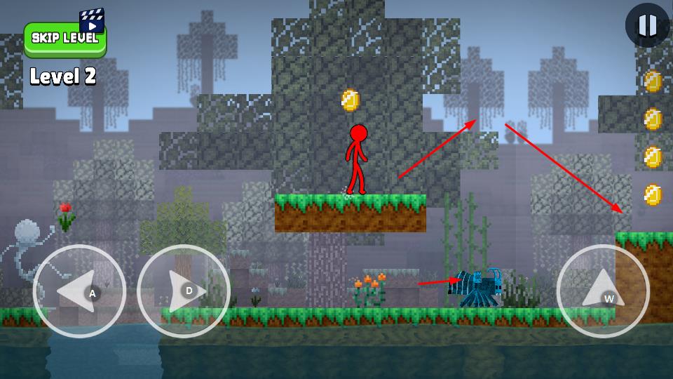 2、在Level2,点击右侧跳跃键跨越障碍,收集金币,应对白色敌人,拓展冒险路线。