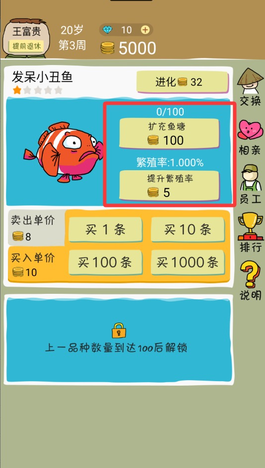3、记得时不时点进化,进化之后鱼的品种和属性都会变强,收益也跟着涨,早点升没坏处。