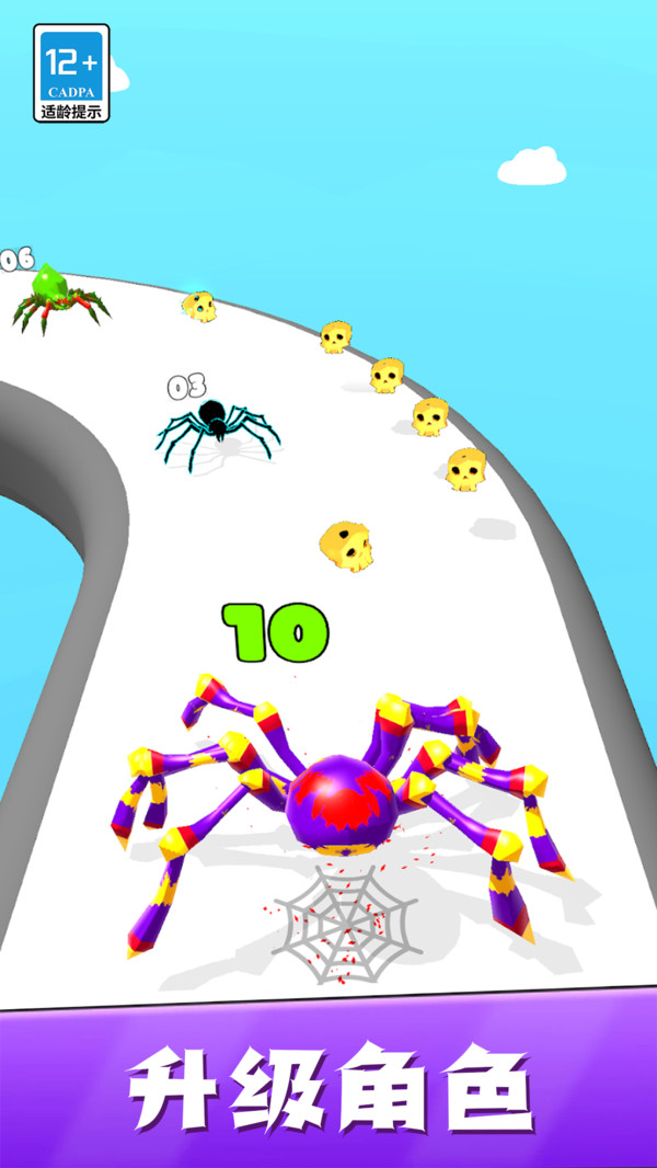 酷跑大挑战带你操控灵活的蜘蛛角色,在紧张刺激的赛道上不断奔跑前进。玩家需要巧妙躲避障碍,并通过接触同等级或更低等级的蜘蛛来完成合成与进化,让角色实力逐步提升。酷跑大挑战节奏紧凑,色彩鲜艳的画面与明快音乐结合,带来沉浸式体验。