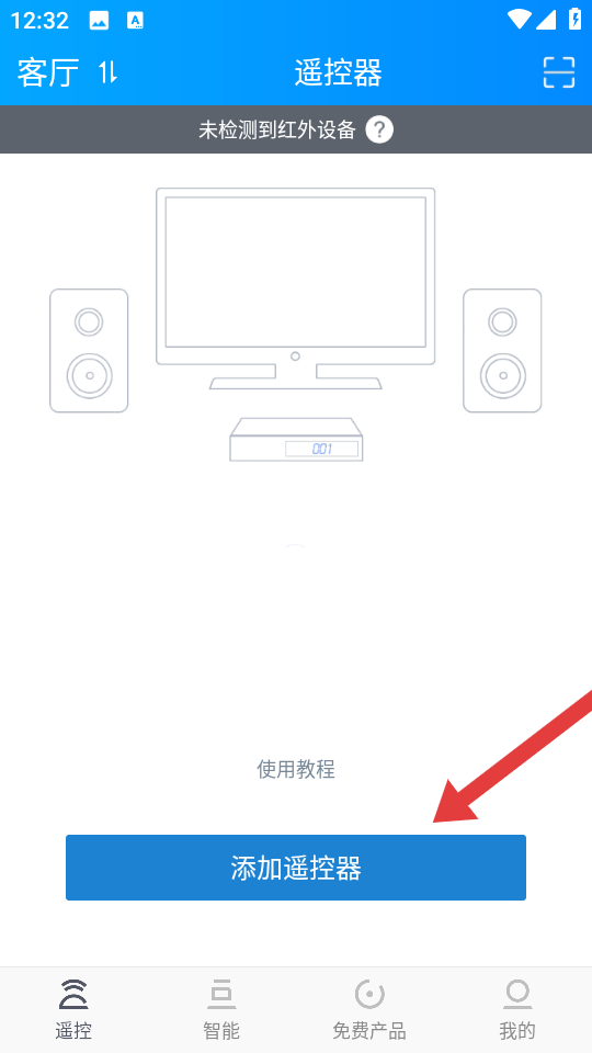 1、打开遥控精灵APP,进入遥控器页面后,点击添加遥控器按钮,启动设备匹配的流程。